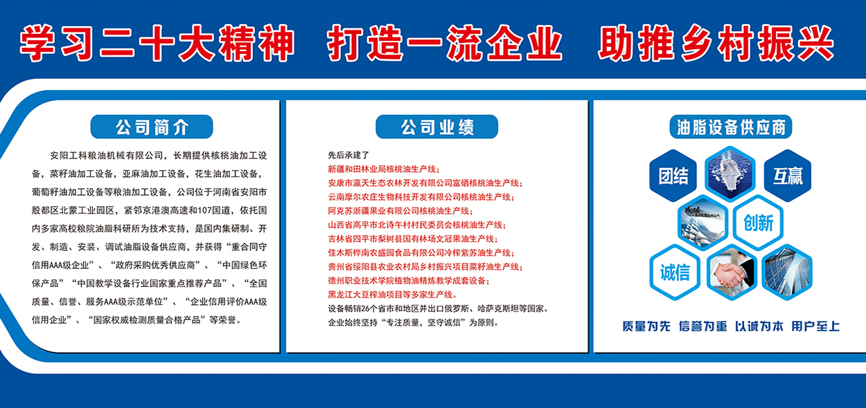安陽工科糧油機(jī)械有限公司,長期提供核桃油加工設(shè)備,茶籽油加工設(shè)備,菜籽油加工設(shè)備,亞麻油加工設(shè)備,花生油加工設(shè)備,葡萄籽油加工設(shè)備等糧油加工設(shè)備,公司位于河南省安陽市殷都區(qū)北蒙工業(yè)園區(qū),緊鄰京港澳高速和107國道,是國內(nèi)集研制、開發(fā)、制造、安裝、調(diào)試油脂設(shè)備供應(yīng)商。先后承建了新疆和田林業(yè)局核桃油生產(chǎn)線,安康市瀛天生態(tài)農(nóng)林開發(fā)有限公司富硒核桃油生產(chǎn)線,云南摩爾農(nóng)莊生物科技開發(fā)有限公司核桃油生產(chǎn)線,阿克蘇浙疆果業(yè)有限公司核桃油生產(chǎn)線,山西省高平市北詩午村村民委員會核桃油生產(chǎn)線,吉林省四平市梨樹縣國有林場文冠果油生產(chǎn)線,,佳木斯樺南農(nóng)盛園食品有限公司冷榨紫蘇油...